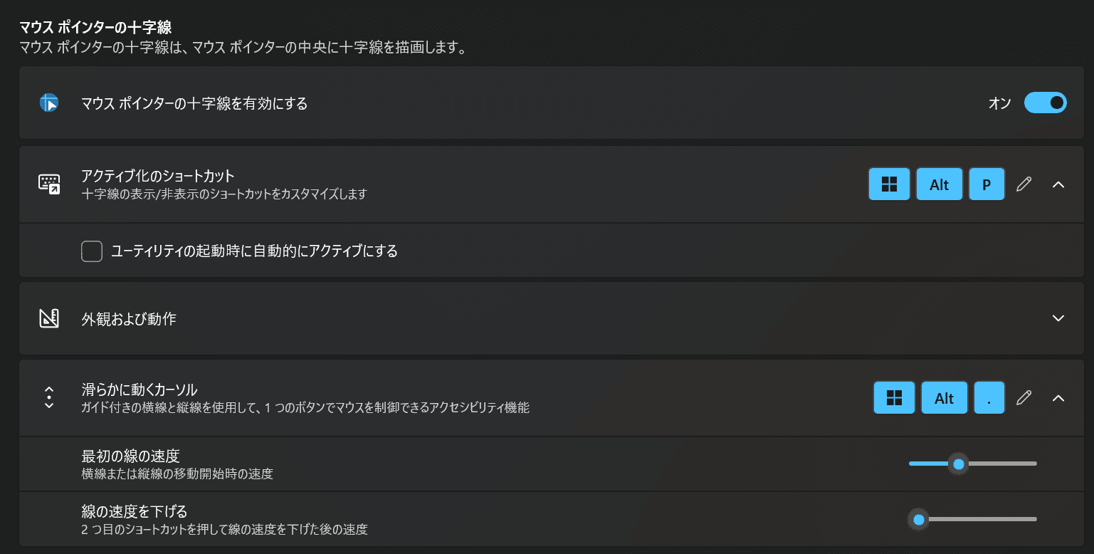 今回のアップデートは、パワーユーザーのためだけのものではない。アクセシビリティ分野においても、静かだが重要な一歩を踏み出している。マウスポインターの十字線ユーティリティに追加された新機能「滑らかに動くカーソル」がそれだ。