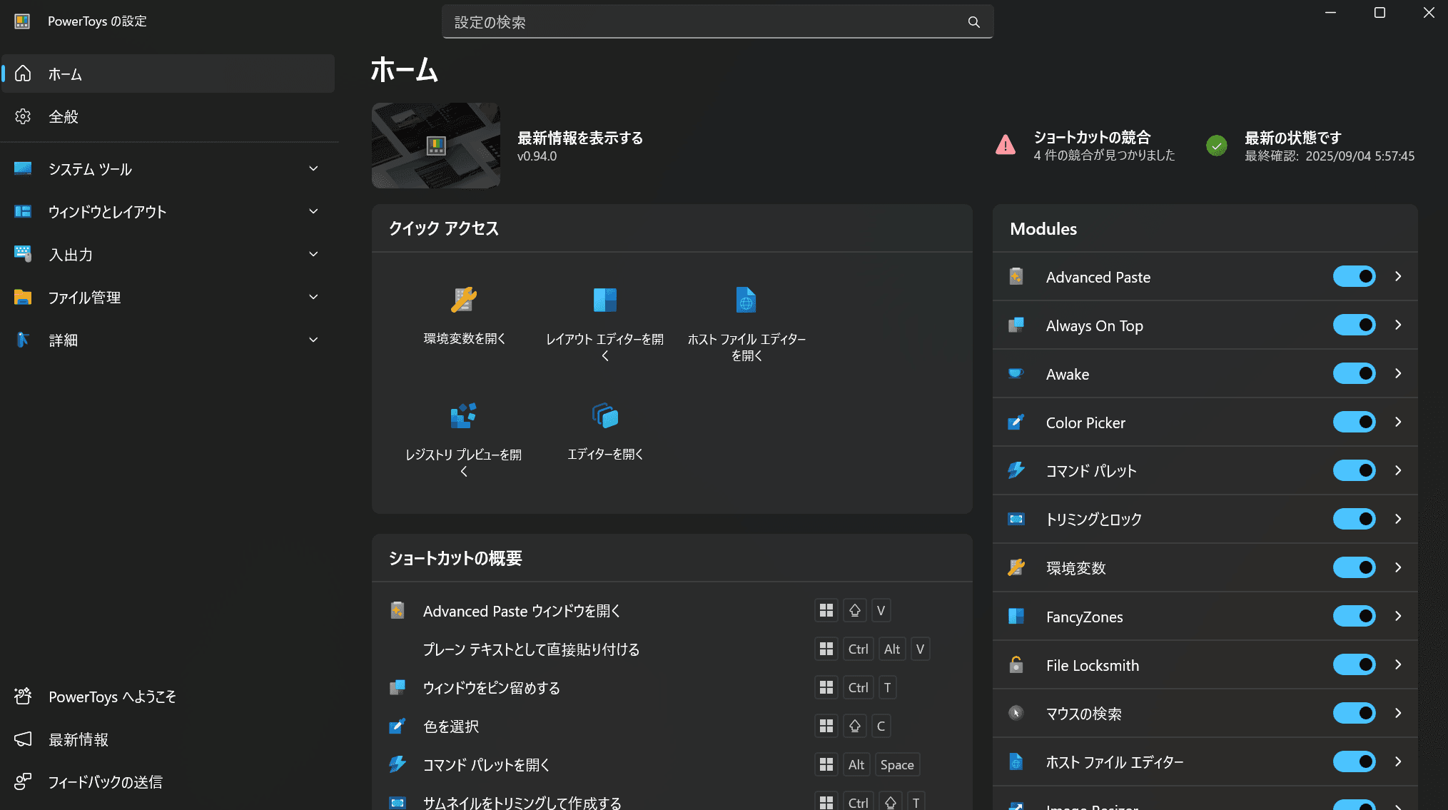 - ダッシュボードでの通知: PowerToysのホーム画面(ダッシュボード)に、現在発生している競合の総数を示す新しいタイルが追加された。