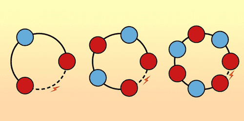 奇数サイクルゲームは、2人のプレイヤーが協力して行うゲームである。審判は、奇数の頂点を持つ円環グラフ(サイクル)上の、同じ頂点または隣接する頂点のペアを各プレイヤーにランダムに割り当てる。プレイヤーは、事前に決められた戦略に従い、相手と直接通信することなく、各頂点に色(赤または青)を割り当てる。