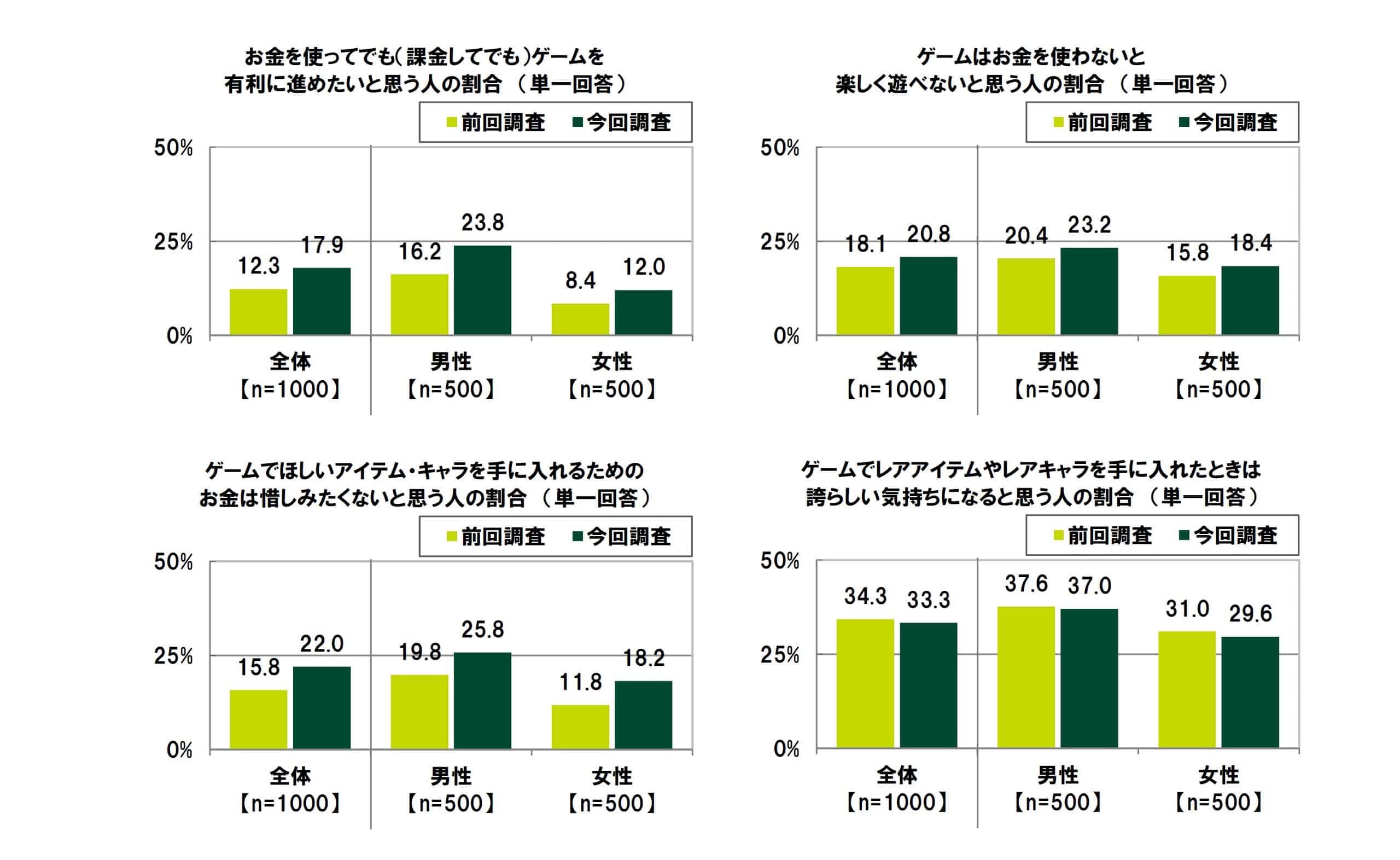 また、「ほしいアイテム・キャラを手に入れるためのお金は惜しみたくない」に「そう思う」と回答した割合も、男性で25.8%(前回比+6.0ポイント)、女性で18.2%(前回比+6.4ポイント)と、こちらも男女ともに増加している。これは、特定のアイテムやキャラクターに対する所有欲が課金行動の強い動機となっていることを示唆している。