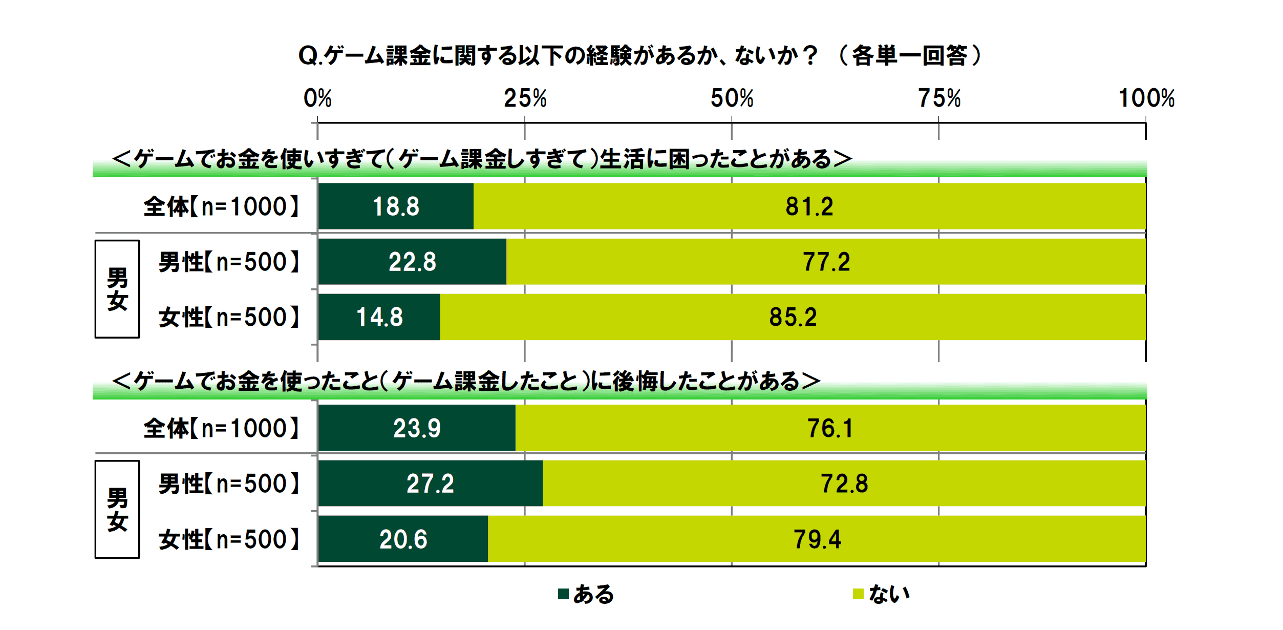 先に見たように、「ほしいアイテム・キャラのためのお金は惜しみたくない」と考える男性が25.8%、女性が18.2%いることを踏まえると、その「惜しみなく使った」結果が、一部で生活困窮や後悔につながっている可能性が示唆される。魅力的なコンテンツへの欲求と、現実的な支払い能力との間で葛藤する若者の姿が浮かび上がってくるようだ。