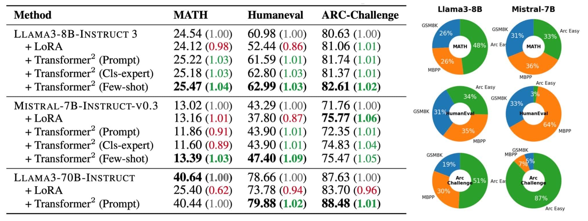 Sakana AIの研究チームは、Transformer²の性能を複数の代表的な言語モデルを用いて徹底的に検証した。主な評価対象となったのは、LLAMA3-8B、MISTRAL-7B、そしてLLAMA3-70Bという異なる規模と特性を持つモデルだ。これらのモデルを用いて、数学的推論からプログラミング、論理的思考まで、幅広いタスクでの性能評価が実施された。