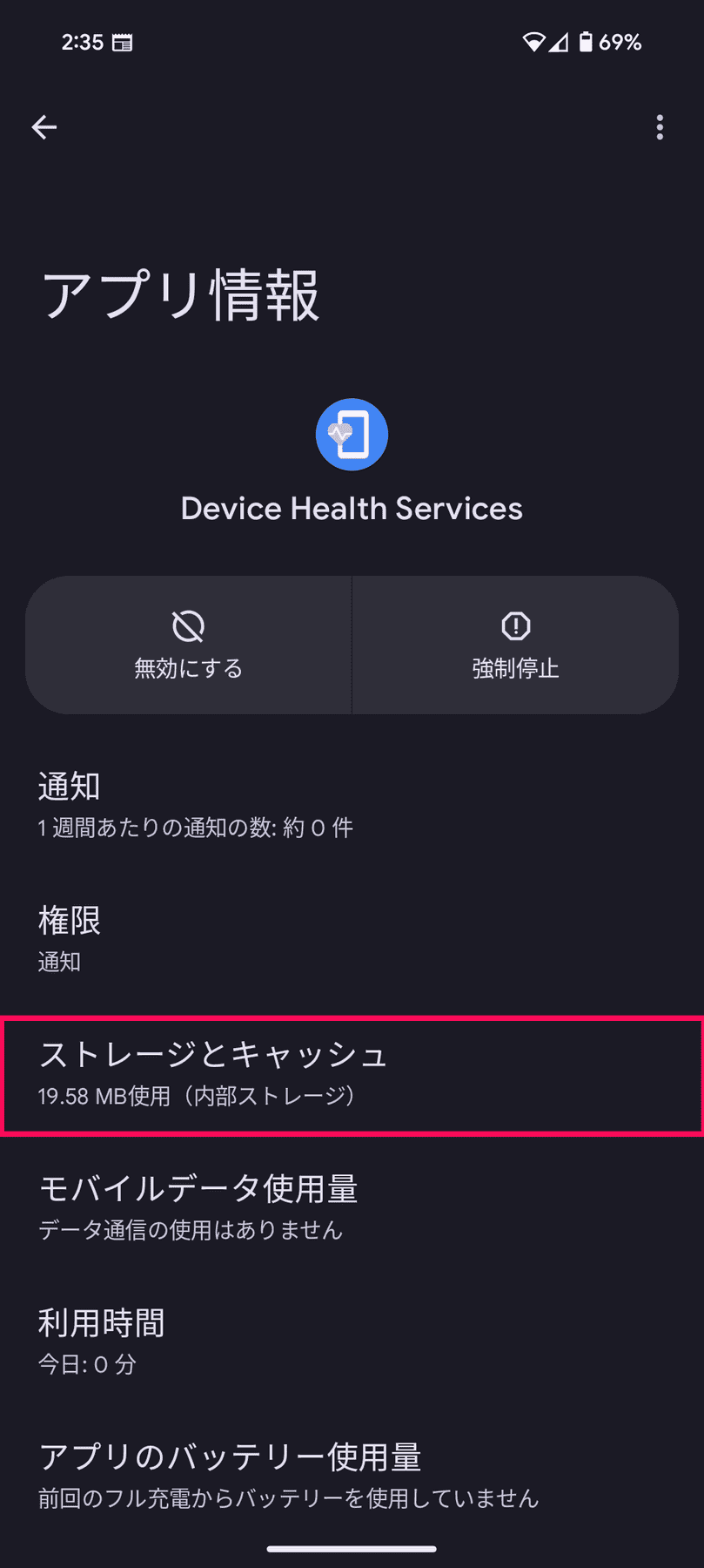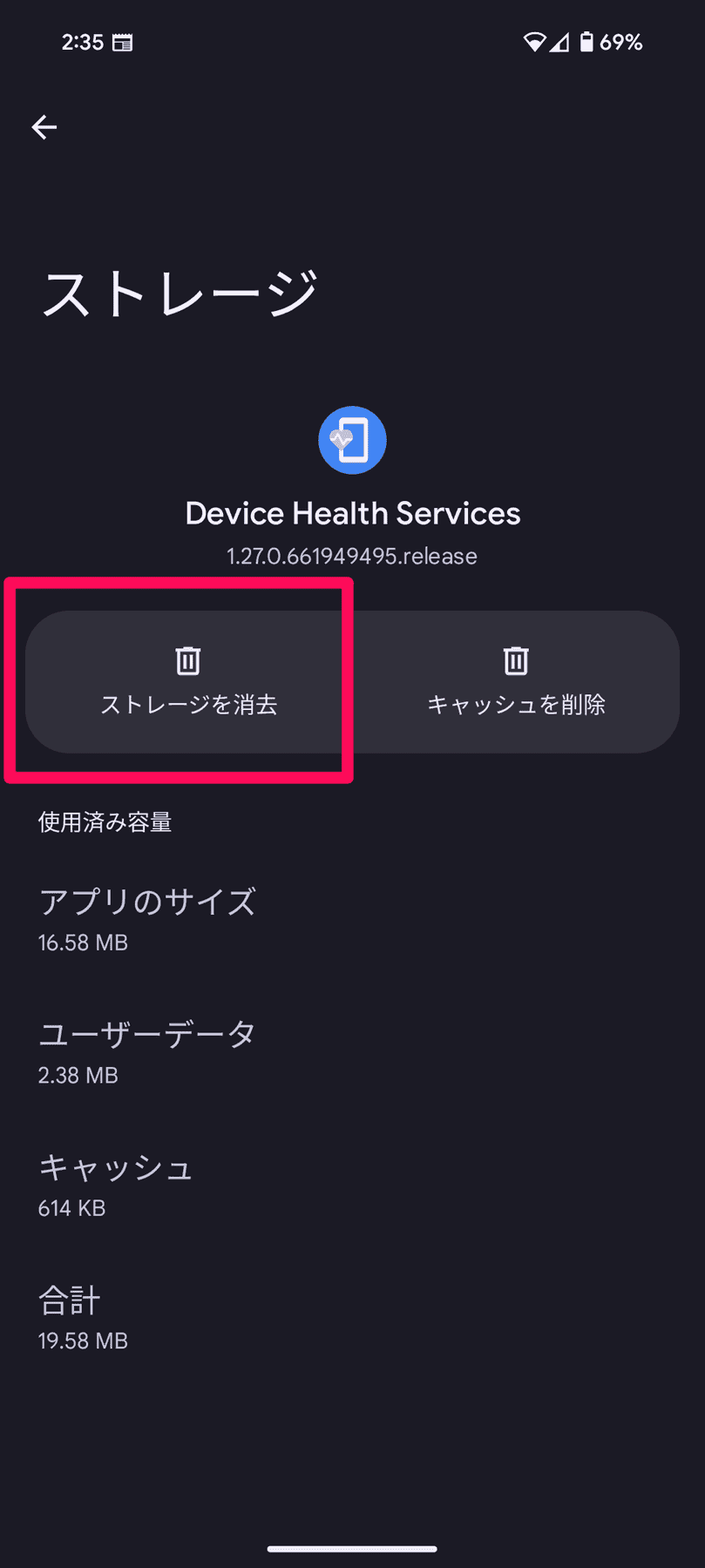 - 「ストレージとキャッシュ」→「ストレージを消去」をタップ