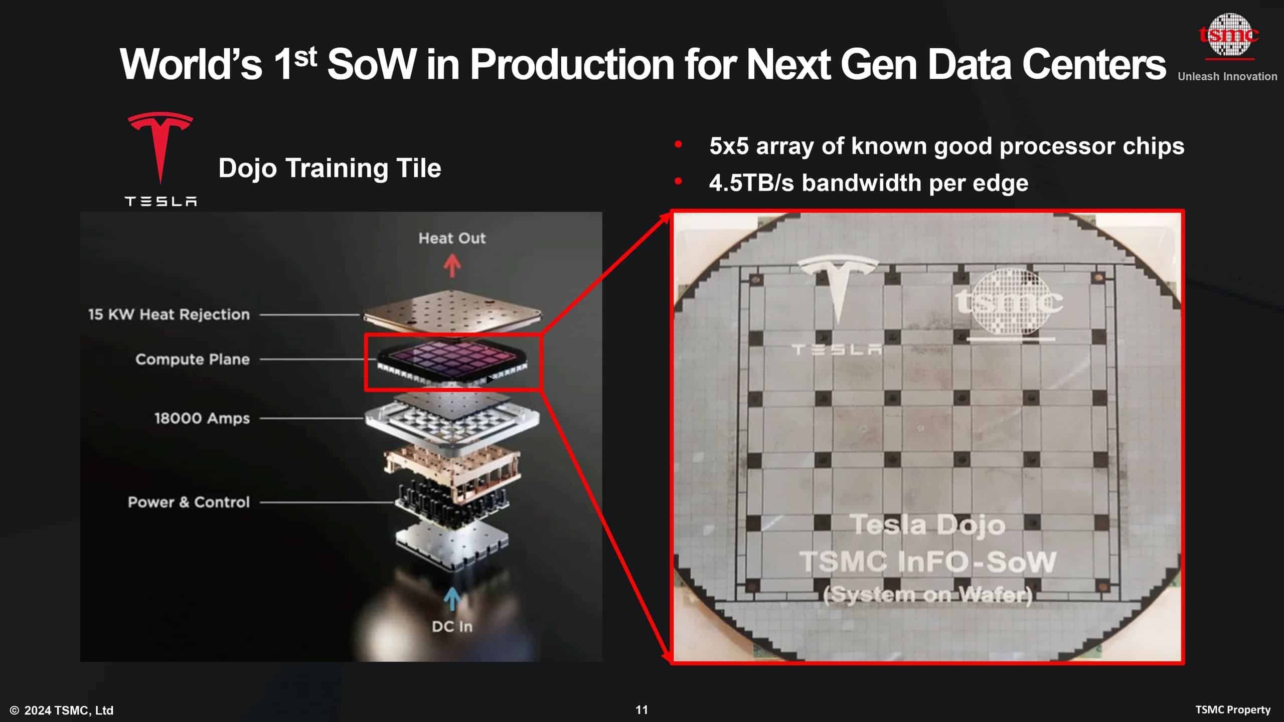 TeslaのDojoモジュールは、654mm²という巨大なダイを25個並べて電気的に接続する「トレーニングタイル」構造を持つ。従来TSMCはSoW(System-on-Wafer)技術でこれに対応してきたが、同社のCoWoS系パッケージングラインはAI需要の急増で逼迫。少量かつ特殊なTesla案件は後回しになりやすくなっていた。