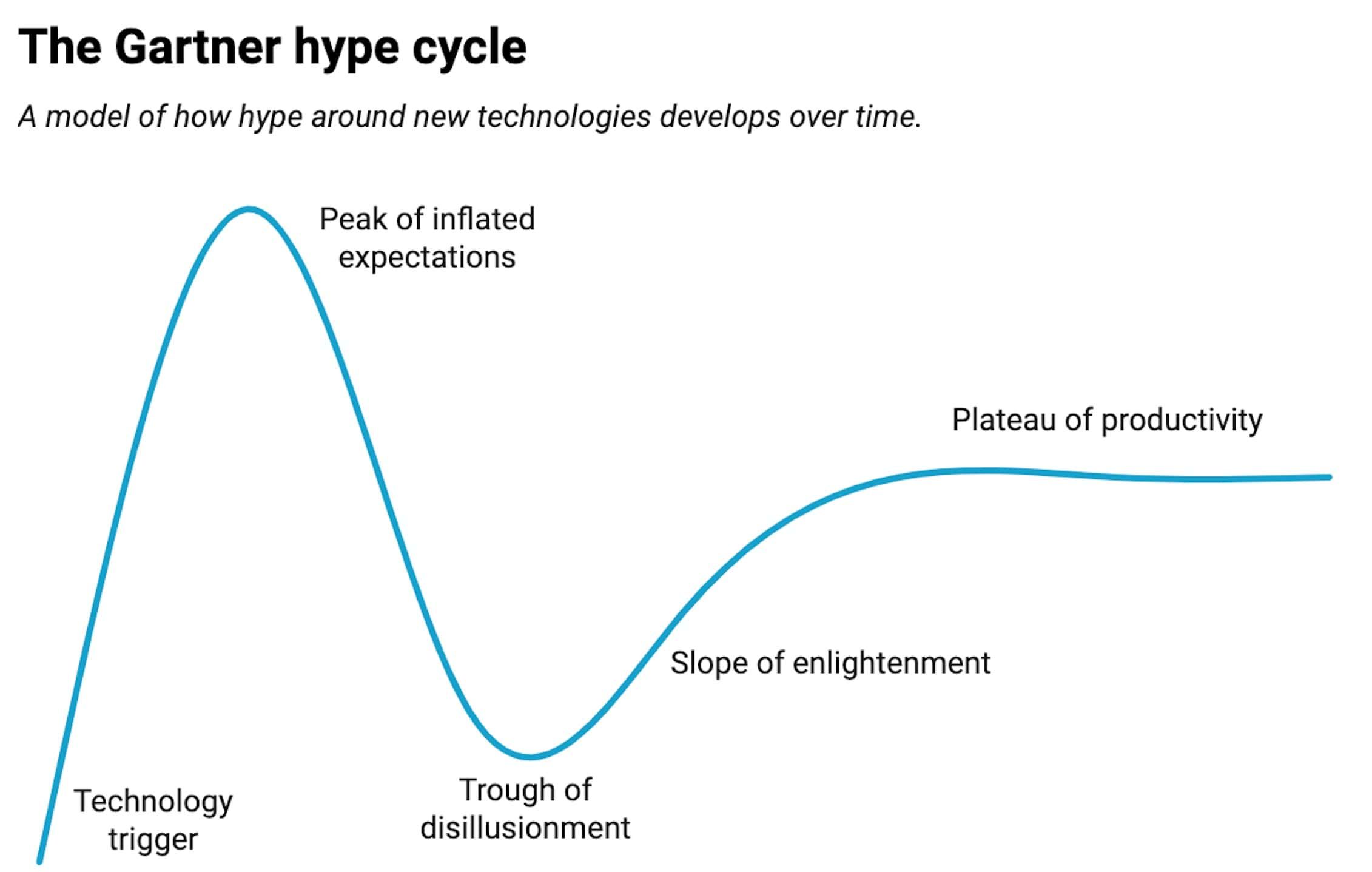 この広く使われているモデルは、技術の初期の成功が過度に膨らんだ期待を生み出し、最終的にはその期待が実現されないという繰り返されるプロセスを説明している。初期の「過度な期待のピーク」の後に「幻滅の谷」が来て、その後「啓発期の坂」が続き、最終的に「生産性の安定期」に達する。