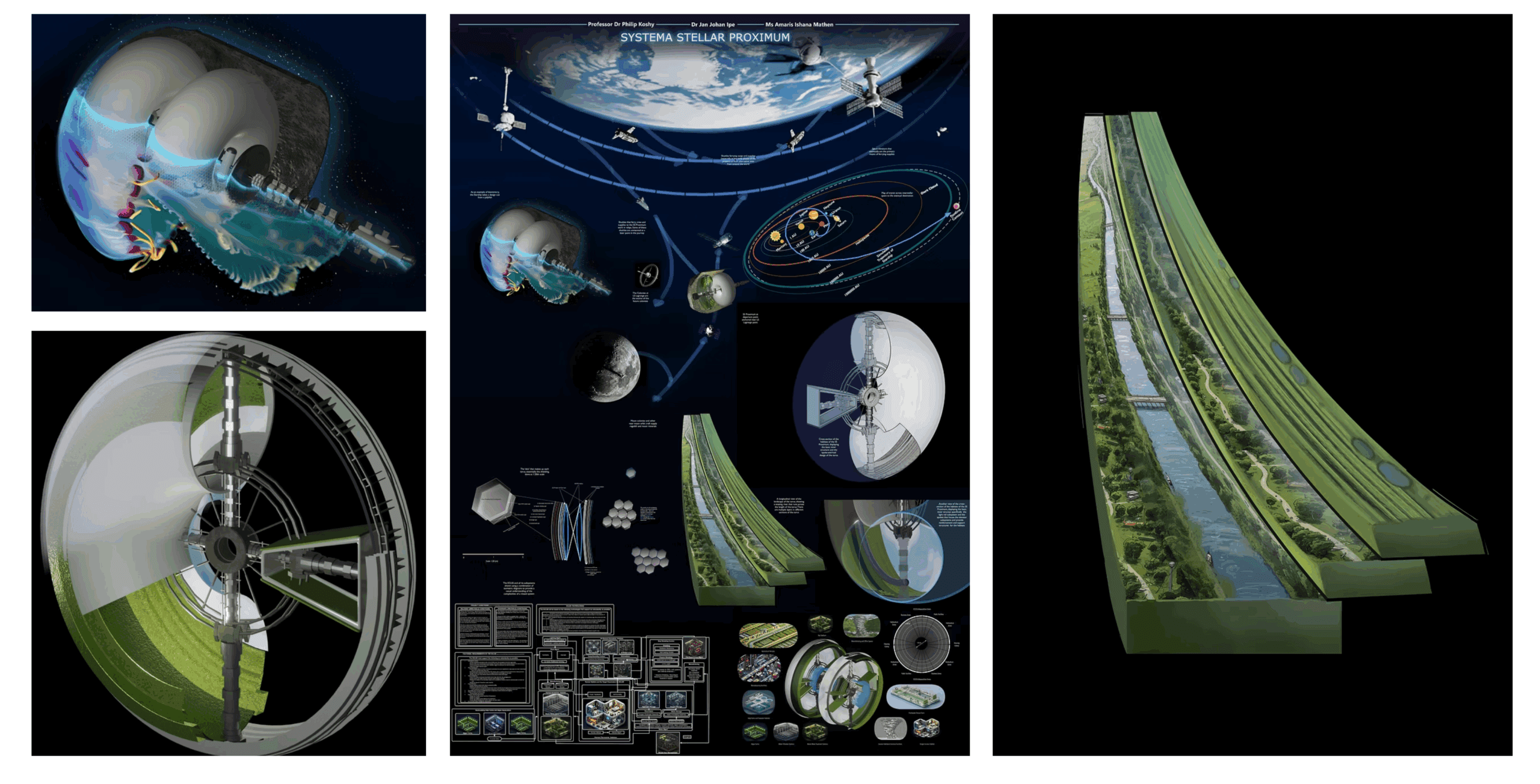 3位受賞チームは、McMaster Universityの機械工学教授Dr. Philip Koshy、医師・医療専門医Jan Johan Ipe、グラフィックデザイナーAmaris Ishana Mathenで構成されていた。彼らのコンセプトはSystema Stellare Proximumで、くりぬかれた小惑星コア内の2つの反対回転Stanford Toriiを持つ恒星船である。船は量子AI航法システムを持ち、最初は核パルス推進を使用してから第2段階でイオン推進に切り替える。彼らが提案書で説明するところによれば: