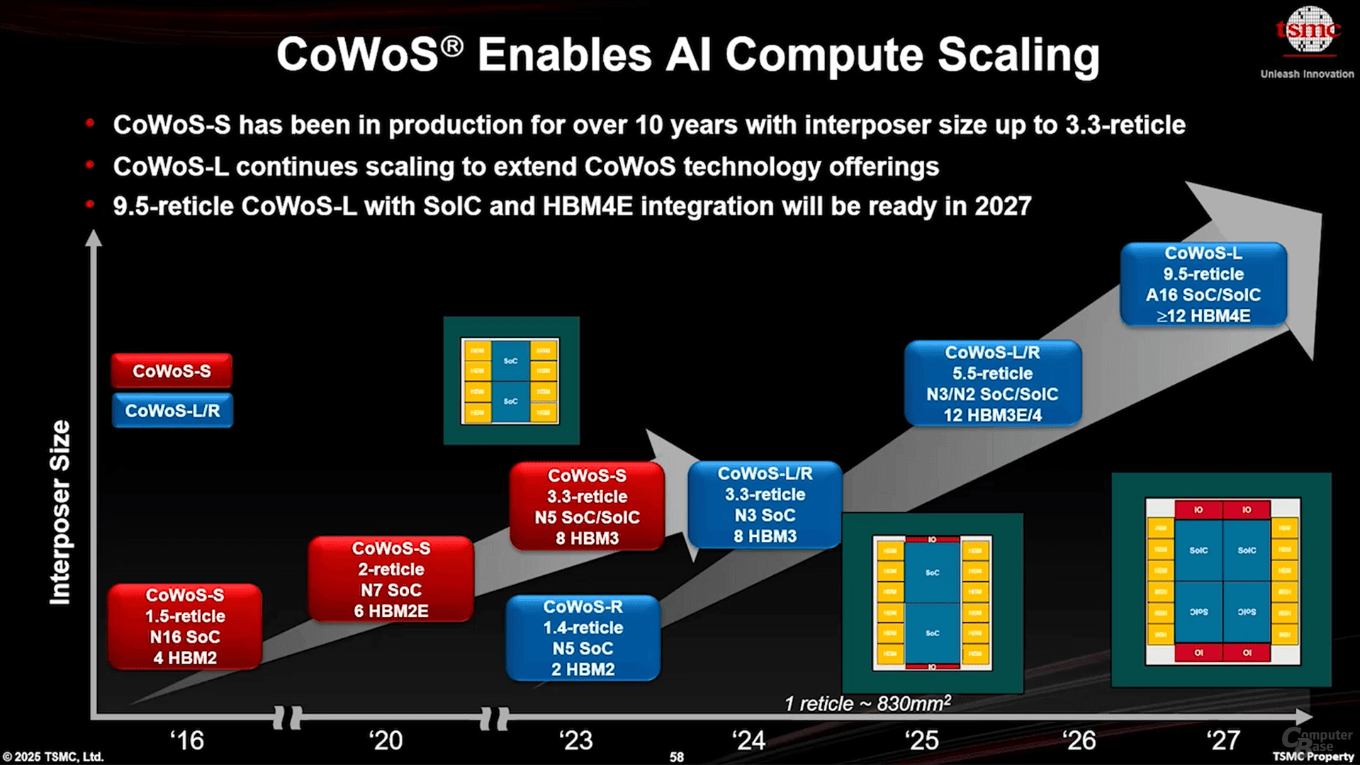 CoPoSは、単に基板を大きくしただけではない。その本質は、TSMCがCoWoS-L(NVIDIAやAMD向け)やCoWoS-R(Broadcom向け)で培ってきた技術の延長線上にある、より巨大で自由度の高い統合プラットフォームである。