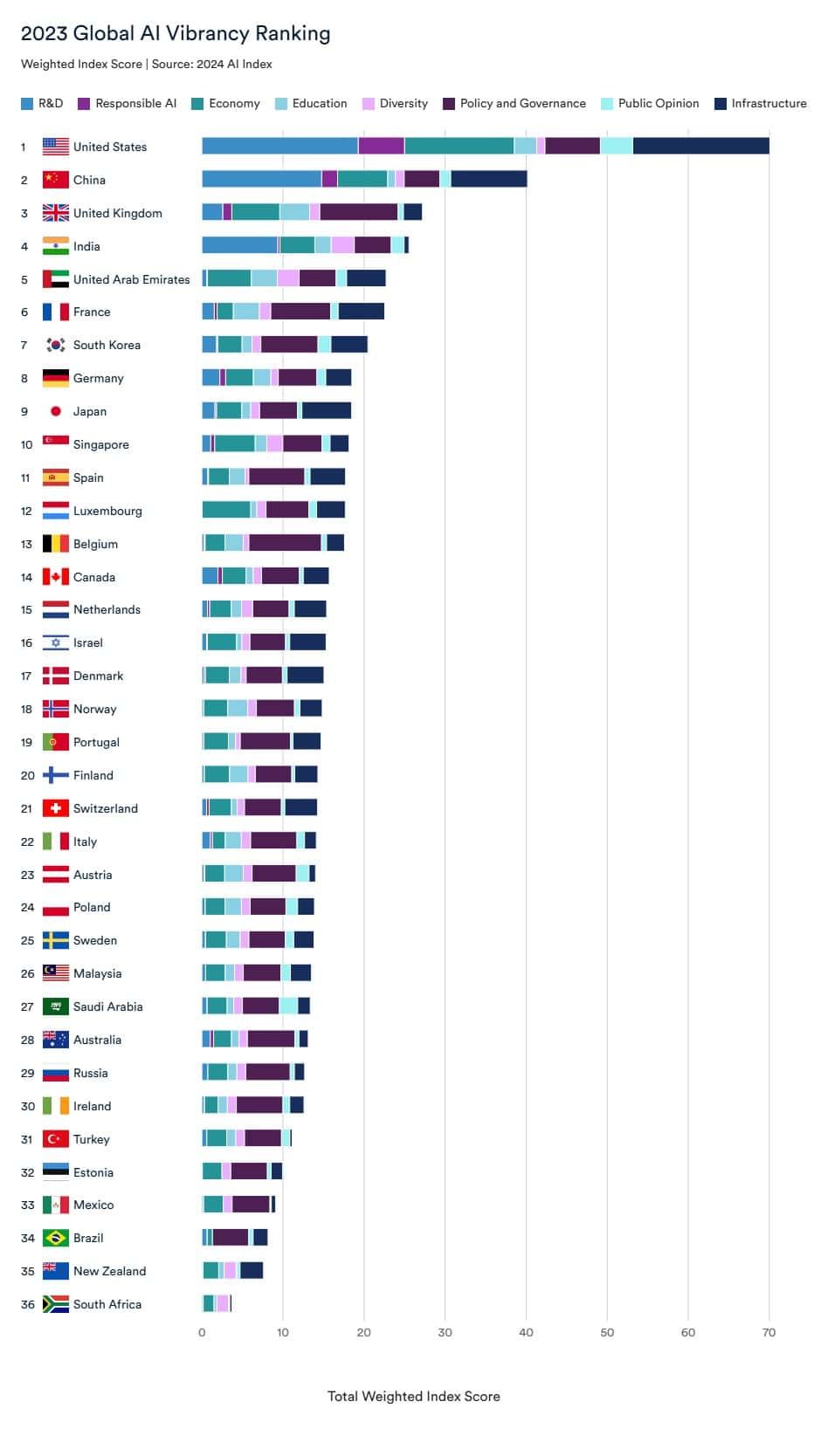 5位のUAEは、戦略的なAI投資で頭角を現している。MicrosoftによるG42への15億ドルの投資に象徴されるように、国家戦略としてAI開発に注力している。特に、アラビア語AIモデル「Jais」の開発は、言語の多様性におけるAI開発の重要な成果として評価されている。
