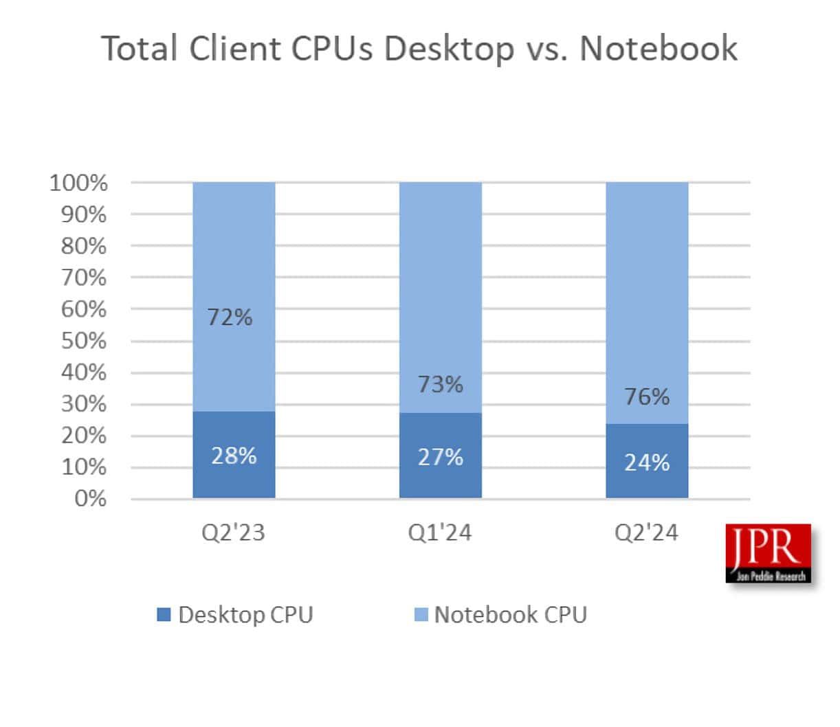さらに注目すべきは、前年同期比で16%の成長を達成したことだ。この成長率の内訳を見ると、デスクトップ向けGPUが21%、ノートブック向けGPUが13%の増加を示している。JPRの社長であるJon Peddie博士は、この予想外の成長について次のようにコメントしている:「第2四半期の出荷台数の急増は、歓迎すべき驚きでした。市場は過去数年間、リズミカルな浮揚力を見出そうと揺れ動いています。貿易戦争、パンデミック、政治選挙、金利など、あらゆる混乱を考えると、いわゆる正常性を見るのはしばらく難しいでしょう」。
