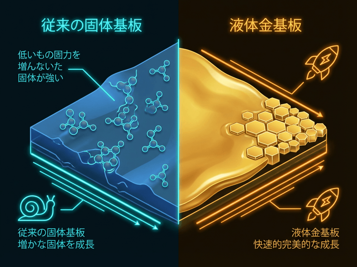 従来の固体基板には目に見えない凹凸や結晶の境目(粒界)が存在し、これが原子の移動を阻害して成長を遅らせていた。研究チームは基板の表面を液体の金で覆うことで、この障壁を完全に消し去った。液体の表面には一切の粒界が存在しない。それは前駆体の原子にとって、摩擦を全く感じさせない滑らかな「スケートリンク」を意味する。