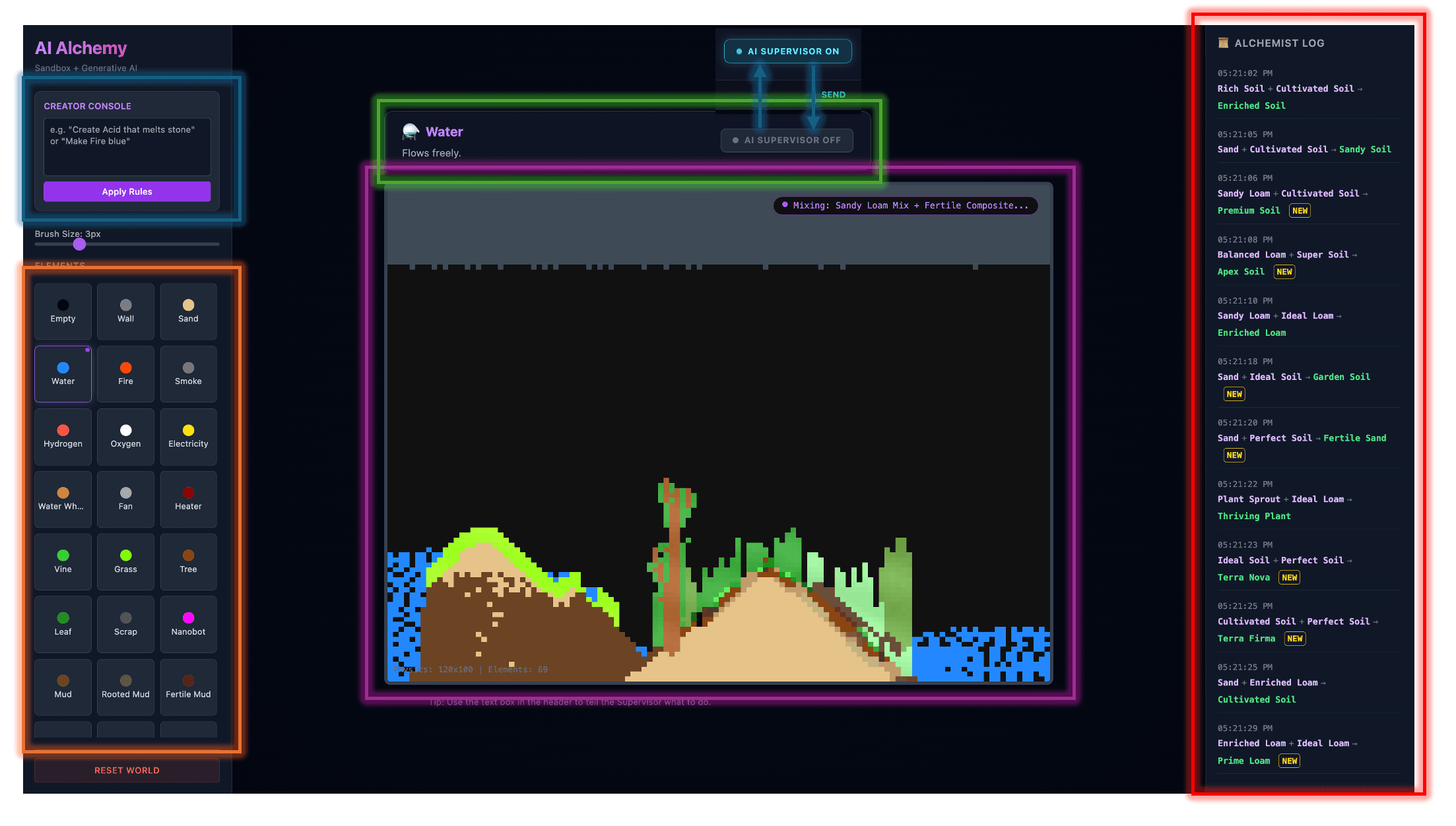 - 創発的ルール: 従来の水や火といった固定要素に加え、ユーザーが新しい要素を定義できる。未知の要素同士が接触した際、LLMが物理的制約の中でどのような反応が起こるか(例:Life + Fire = Ash)を判定し、新しいルールとして即座にシミュレータに組み込む。