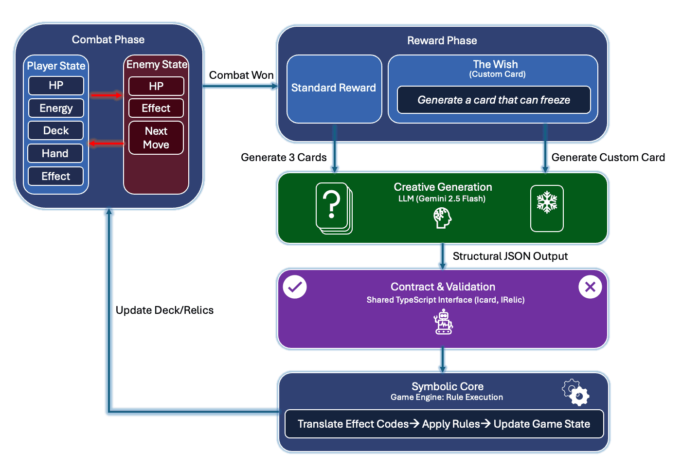 - Neuro-symbolic Core: システムは自然言語のリクエストを解析し、ゲームエンジンが解釈可能な「効果コード」と、バランス調整された数値(コストやダメージ量)に変換する。ここでも型定義によるバリデーションが機能し、ゲームバランスを崩壊させるような不正なカード(無効な属性など)の生成を防いでいる。
