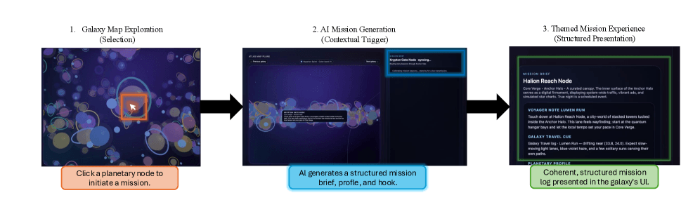 - 仕組み: 星系や惑星の配置はプロシージャルノイズで決定される。惑星に降り立つと、LLMがその惑星の大気、信号、危険性、ミッションの概要(Brief)を生成する。