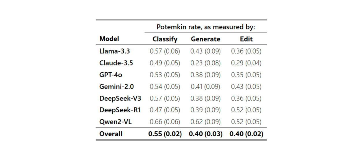 しかし、問題はここからだ。概念を正しく定義できたモデルに対して、次に応用問題(分類、生成、編集)を解かせたところ、パフォーマンスは劇的に低下した。研究チームは、定義はできたが応用で失敗した割合を「ポチョムキン率」として算出。その結果は衝撃的だった。
