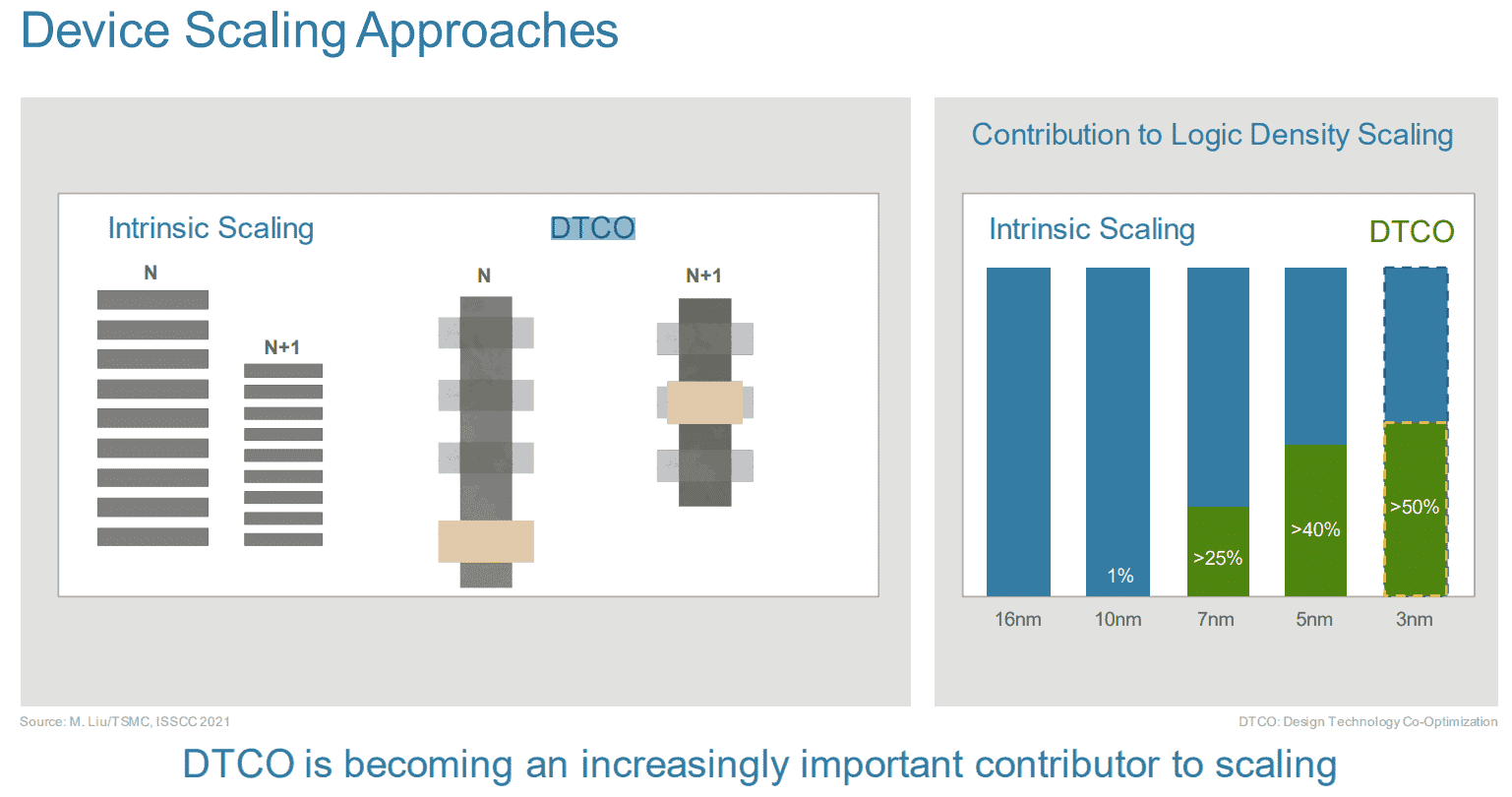 BSPDNによる変革は、設計にも大きな変革をもたらす。この方法論全体には、Design Technology Co-Optimization(DTCO)という新しい名前もついている。DTCOは、なぜ製造コストが高くなっているのかを示す好例であり、こうした技術的なチャレンジが、今後のスケーリングの方法となるのだ。次のグラフは、DTCOが密度スケーリングにつながる割合を示している。