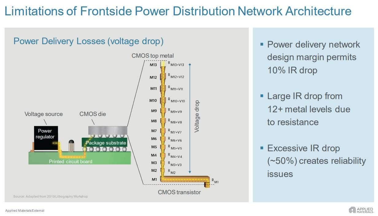 パッケージ内の電気を移動させることは、半導体の総合的な性能と電力に影響するため、エネルギーの観点から最も重要なことの1つだ。だが、半導体のマイクロレベルでの抵抗の課題を超えて、一般的な半導体の配電層では、複雑さの限界に達している。一般的な半導体は、ウェハーの表側で何層にも積み重ねられており、長い間、この方法でスケーリングしてきたが、何層もの金属配電網があり、今やIR(抵抗)ドロップが累積して手に負えなくなり始めているのだ。