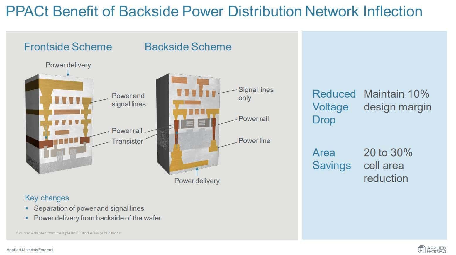 BSPDNでは、パワーレールがロジックセルの外側に移動するため、ロジック密度が向上する。Applied Materialsは、これは2世代分のリソグラフィースケーリングに相当すると推定している。電力はトランジスタの直下から供給されるため、IRドロップは大幅に低減されるのだ。