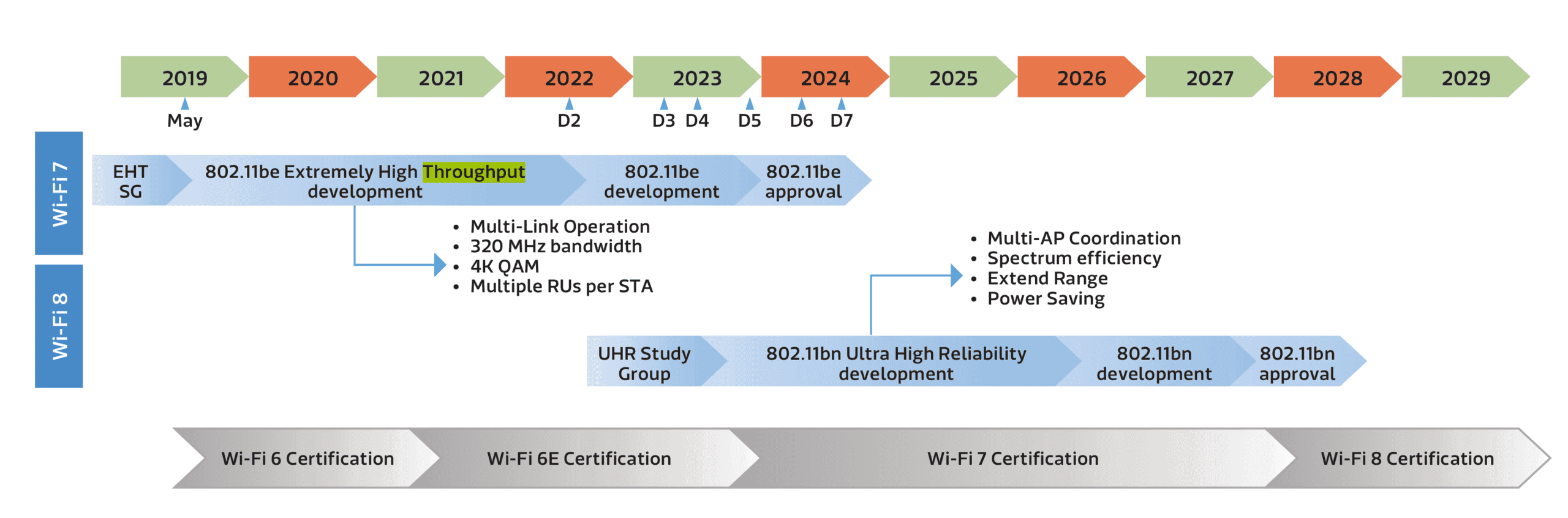 Wi-Fi 8の現在の計画では、Wi-Fiが最低100Gbpsに達する集約スループットを持つネットワークをサポートできるようにすることに焦点が置かれている。 これを可能にする青写真には、デバイスがネットワークとどのように相互作用するかをターゲットにすることが含まれる。 注目すべき進歩には、協調空間再利用(Coordinated Spatial Reuse)、協調ビームフォーミング(Coordinated Beamforming)、ダイナミック・サブチャネル・オペレーションなどがある。